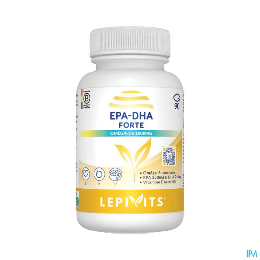 EPA-DHA Forte de chez LEPIVITS contient une huile de poisson riche en oméga-3 et concentrée en acides gras polyinsaturés EPA (acide eicosapentanoïque) et DHA (acide docosahexanoïque). L'huile est fabriquée à partir d'anchois & de sardines sauvages et est certifiée (Omegatex) sans métaux lourds ni additif toxique. L'huile est extraite d'une pêche durable labellisée "friend of the sea". Les omégas-3 interviennent dans de nombreuses fonctions biochimiques.